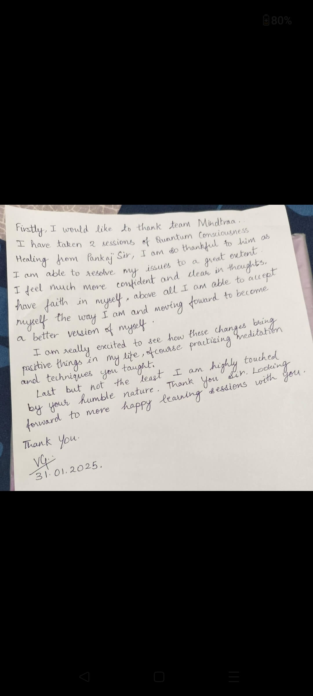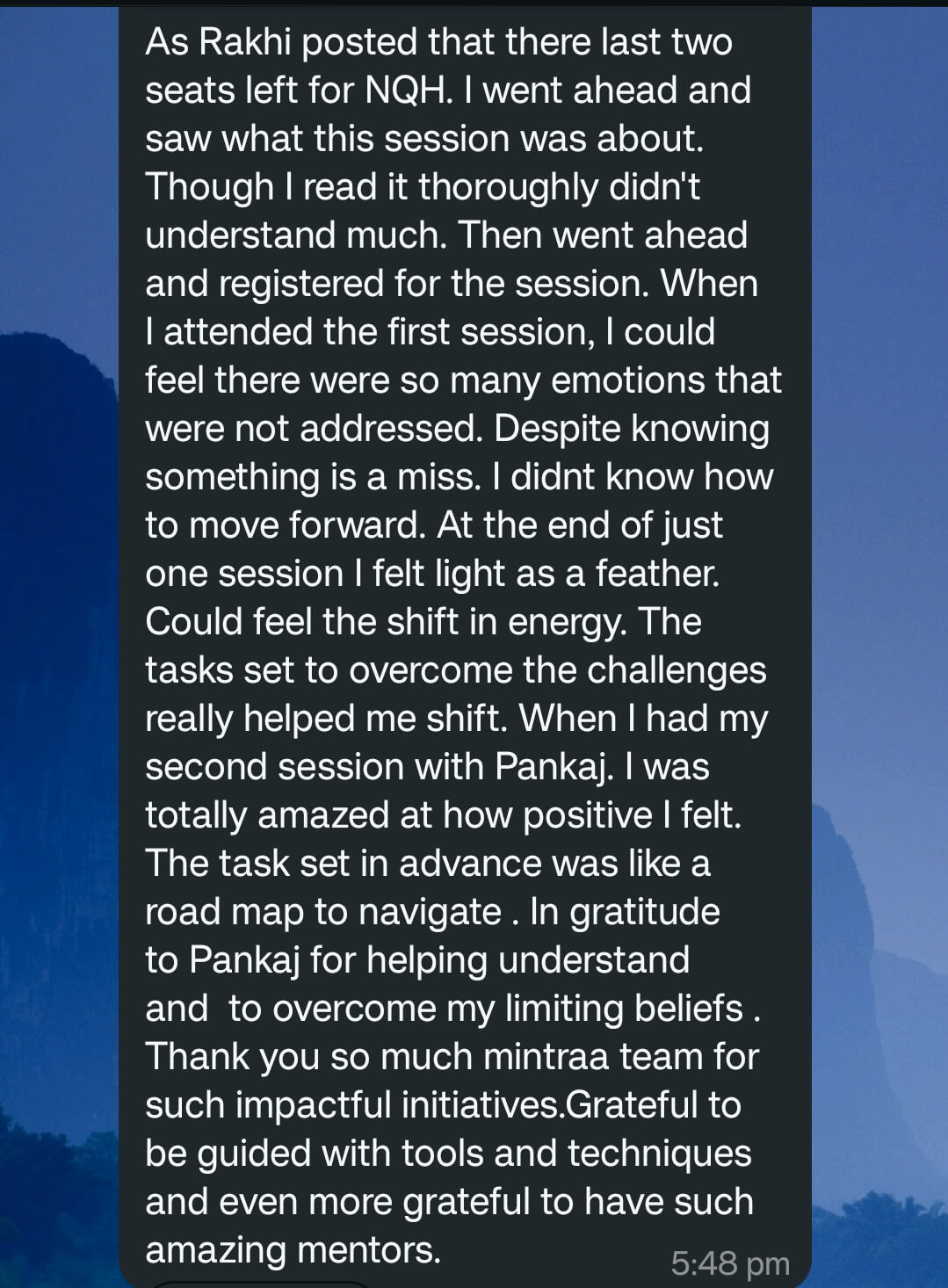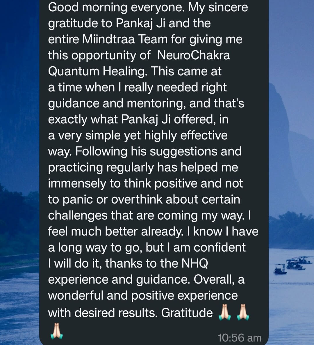 Into 8 sessions of NQH & there is already so much clarity about where do I stand as a Healer after learning so many modalities, what are my strengths & weaknesses, how should I proceed on this journey of healing self & others.Very well researched, developed & scientifically designed wholesome healing package of NQH in easy to understand & practice language & communication by Dr Amaey & Pankaj Sir has really transformed and integrated my Mind , Emotion & Energy triad.